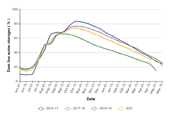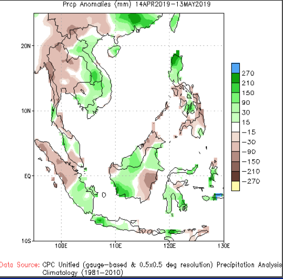 从泰国水位线预计情况看,4月份以来的干旱导致水位线下降迅速,未低于三年水位线均值,但是对比2017、2018年水位情况仍然相对较好。