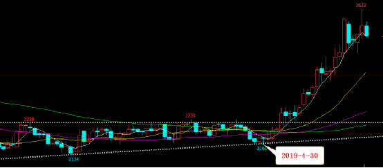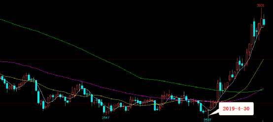 豆粕(图2)自2019年4月30日2537低位反弹,至昨日最高涨至3031,上涨494个点,涨幅19.47%,同属于农副产品的菜粕(图3)涨幅更是达到21.66%;