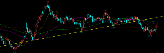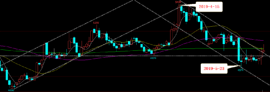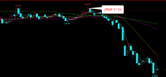 与农产品普涨背道而驰,棉花(图4)大幅下跌,自2019年4月15日16225高位下跌至昨日12910,下跌3315个点,跌幅达20.43%。