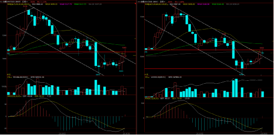 郑糖(图7),国内进入纯销售期,国内食糖购销旺季临近,短期购销需求有望增加,虽然广西、云南均已结束榨季生产2018/19榨季全国产量已基本确定,但仍有不确定因素,如进口量的多少?国储糖会不会出库?打击走私控制情况、潜在的政策方面等因素都需要时刻关注。结合技术面走势看SR909合约、SR001合约在5月下旬低位反弹,成交量缩小,昨日价格突破下降通道,价格反弹至前方K线密集区下沿后回落,价格低位指标背离反弹突破通道线看短期有望延续上涨,但价格反弹前方压力位回落形势仍不明朗需谨慎。(个人观点,仅供参考)