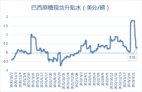 4月份巴西中南部糖厂23/24榨季的开榨进度加快,丰产预期令原糖(VHP)现货对临近交割的纽约原糖5月合约升水(5月船期)承压,下降至31个点的近期低位。不过由于近期原糖期货价格不断突破多年高位,巴西原糖现货价格已达到25.25美分/磅高位。4月上旬降水偏多以及5月份开始巴西港口拥堵风险可能对巴西供应造成影响。