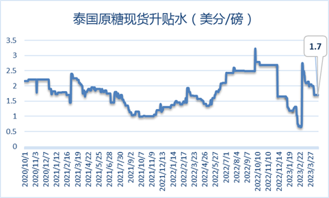 泰国原糖(Hipol)对纽约5月合约价格升水小幅下滑至170点,泰国本榨季甘蔗压榨量略低于预期,加上目前白糖升水高企,泰国原糖重熔量预计增加,后期原糖供应有限或支撑现货升水。