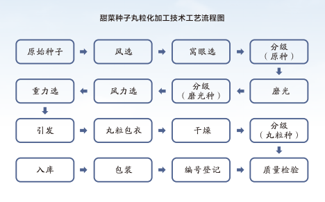 内蒙古甜菜种子加工技术研究团队攻克甜菜单胚种子丸粒化加工各关键技术难题,研发形成了完整的甜菜丸粒化种子加工技术体系。2023年首次在国内形成了从种子清选、磨光、分级精选、种子水洗与引发,到研发出丸粒配方进行丸粒化加工的一整套成熟的丸粒化种子加工技术体系,建立了小型中试量产车间,实现了对国产自育甜菜单胚种的丸粒化加工,并在生产上大面积示范应用,破解了甜菜种子丸粒化加工各重要环节的关键技术,推动我国甜菜自育单胚杂交种商业化应用。