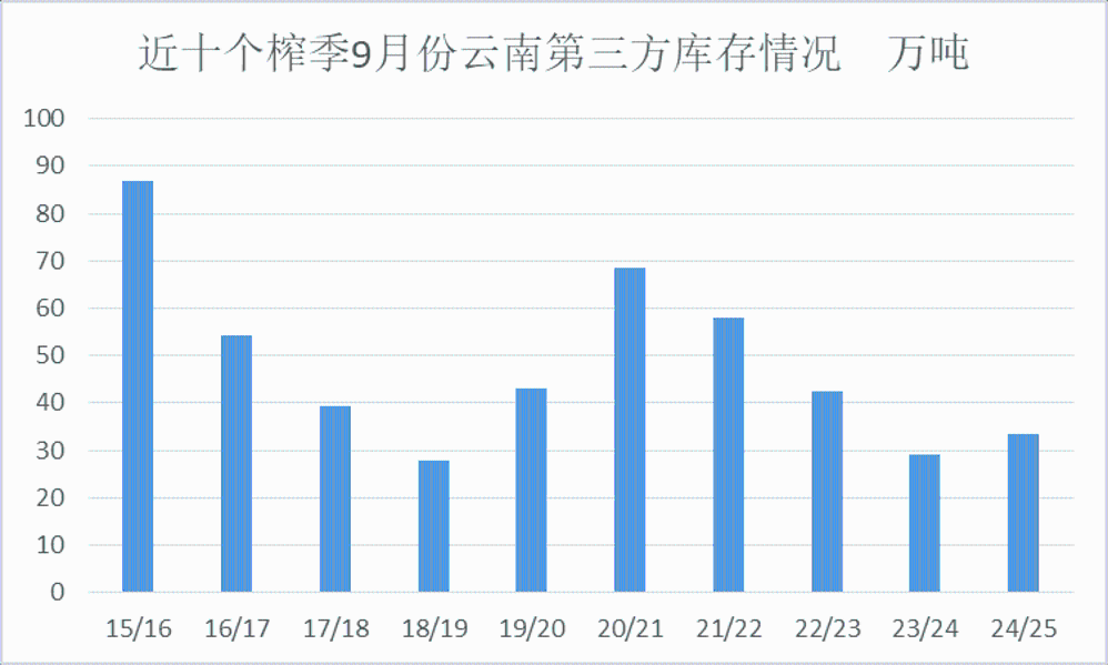 2025年9月云南第三方库存为33.31万吨,同比增加4.38万吨,环比减少19.47万吨。与十年来云南9月第三方库存均值49.87万吨相比,库存数据中性偏多。