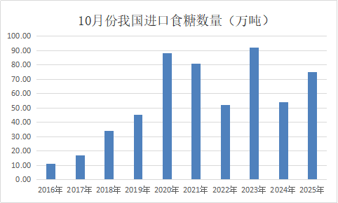 海关总署公布的数据显示,2025年10月我国进口食糖75万吨,同比增加21万吨,为近十年同期第四高的水平。其中白糖3.41万吨,原糖71.15万吨。