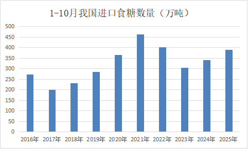 2025年1-10月我国累计进口食糖390万吨,同比增加48万吨,继续保持在近十年同期第三高的水平。其中白糖25.96万吨,原糖363.96万吨。