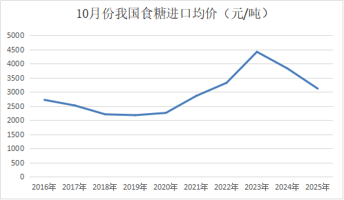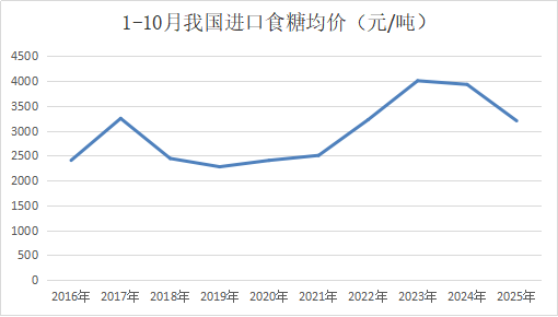 2025年1-10月我国进口食糖均价为3203元/吨(到岸价),同比下降730元/吨,降至近四年同期最低水平。
