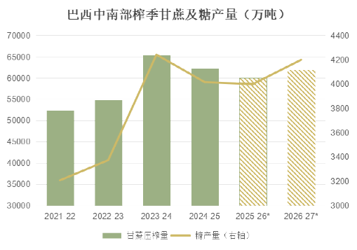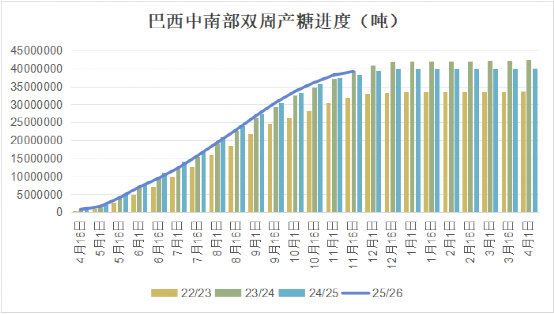 综合来看,由于榨季后期糖厂加速转向乙醇生产,糖产量下滑明显且收榨进程提速,而甘蔗质量指标的好转对榨季末产量提升的影响较小,因此25/26榨季巴西中南部最终甘蔗压榨量或落在5.95-6亿吨区间,糖产量预计在4000万吨上下。即将公布的11 月下半月双周报将是最后一期影响市场调整最终产量的数据。