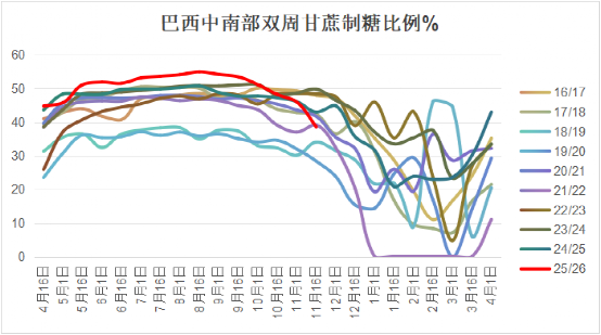巴西中南部25/26榨季已步入收尾阶段,截至11月中旬,累计压榨甘蔗5.763亿吨,同比减少1%;累计产糖3920万吨,同比增长2%,累计制糖比例51.5%,较去年同期的48.4%提升3.1个百分点。截至11月中旬已有120家工厂收榨,较上一榨季同期增加50家。