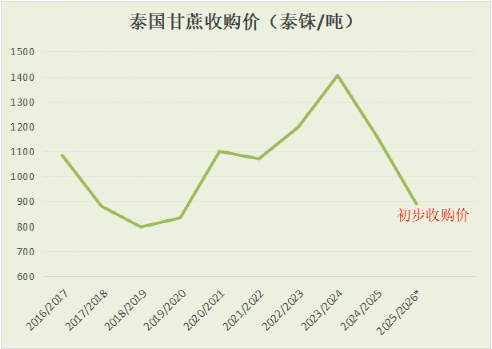 泰国政府公布的25/26榨季甘蔗收购价为890泰铢/吨,同比下降23%,创近10年最低。据有关机构测算,部分农户种植甘蔗的收益已不及木薯,开始将受病虫害影响的甘蔗田改种木薯,或导致26/27榨季甘蔗种植面积缩减。