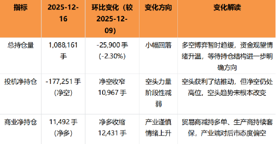 2.商业端多空微调,套保逻辑主导:商业多单环比减少9,958手(-2.44%),商业空单环比增加2,473手(+0.64%),商业净持仓微降至11,492手(净多),较前一周的23,923手大幅收缩。商业多单减持反映贸易商对短期价格反弹信心不足,而商业空单小幅增加体现生产商基于丰产预期的套保操作仍在持续,产业端对后市心态偏空。