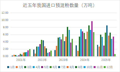 2025年我国17029012项下进口预混粉9.95万吨,其中从越南进口最多7.53万吨,其次从泰国和马来西亚进口量均在1万吨左右;同期21069062项下进口预混粉48.63万吨,绝大部分47.81万吨从泰国进口,还有0.26万吨从马来西亚进口。