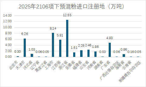 2025年我国17029012项下进口预混粉9.95万吨,进口量最大的是广东5.22万吨,第二是福建1.6万吨;同期21069062项下进口预混粉48.63万吨,其中浙江进口数量最大12.55万吨,第二是上海8.14万吨,第三是天津6.26万吨,第四是江苏5.81万吨,第五是广东4.83万吨。