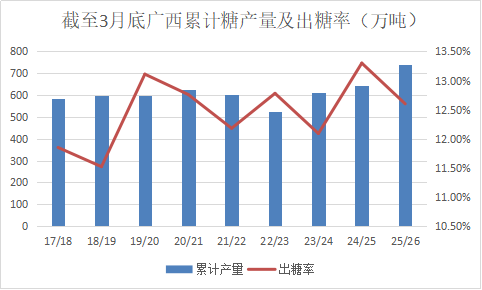 25/26榨截至3月底广西已产混合糖740.72万吨,同比增加94.64万吨,为17/18榨季以来的最高水平;产糖率12.6%,虽然同比降低0.7个百分点,但在近十个榨季当初处于中等水平;其中3月份单月产糖175.59万吨,同比增加146.23万吨,为有记录以来第三高的水平,最高为07/08榨季的192万吨,次高为13/14榨季的189.6万吨。