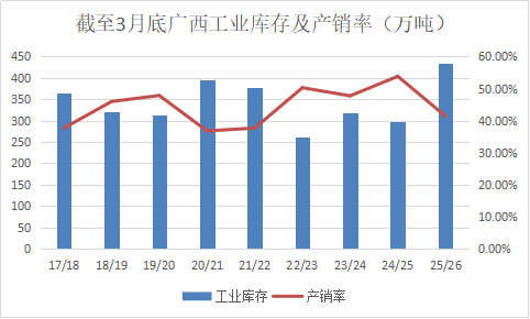 由于广西3月份单月销糖107.29万吨,同比增加47.82万吨,达到有记录以来最高水平,比次高的11/12榨季的95.4万吨还多11.89万吨。25/26榨季截至3月底广西累计销糖量达到306.52万吨的近十个榨季第二高水平,仅同比减少41.28万吨;不过产销率41.38%,同比下降12.45个百分点,在近十个榨季当中处于第四低的水平;工业库存434.2万吨也是17/18榨季以来最高水平,同比增加135.92万吨,比次高的20/21榨季的395.16万吨还多39.04万吨。