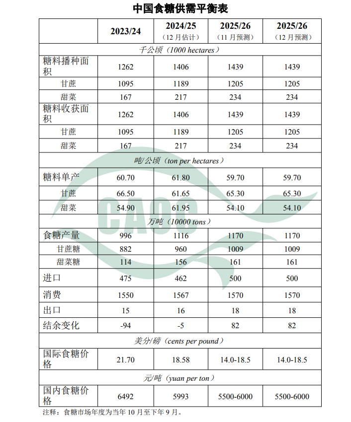 本月对中国食糖供需形势预测与上月保持一致。主产区已全面开启2025/26年制糖期生产。受前期不利天气影响,广西食糖生产进度推迟,截至11月底,广西、云南累计产糖17.87万吨,同比减少37.23万吨,产糖率有不同程度下降。后期新糖上市节奏逐步加快,将密切关注压榨进度、糖分变化及节日备货启动情况。