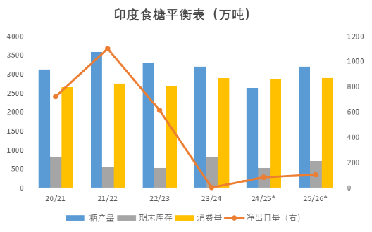 政策与出口层面,印度政府虽已批准2025/26榨季150万吨食糖出口配额,但截至12月底签约出口量约20万吨,仅实际出口约10万吨,尽管近期印度国内价格下跌、卢比贬值等因素使得印度内外价差缩小,但出口窗口仍未打开,在目前的价格水平上市场预计印度本榨季的总出口量仅在80-100万吨左右,将导致过剩进一步增加。