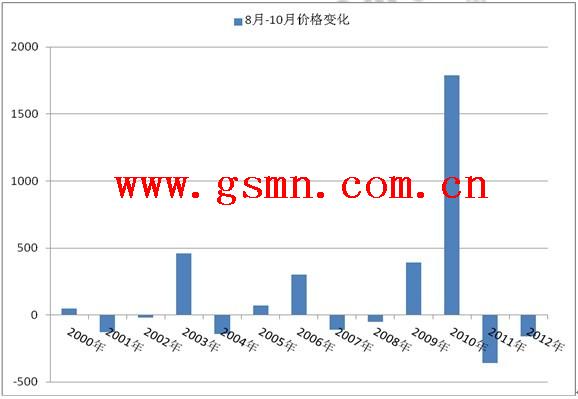 上图为历个榨季8月1日—10月31日的柳州现货价格变化情况,从中可以看出之前13个榨季当中有6个榨季的价格在此期间出现了上涨,上涨的概率为46.2%,这也意味着之前13个榨季出现翘尾行情的概率接近50%。另外从翘尾行情出现的时间来看,2005年、2006年和2009年、2010年出现翘尾行情,2007年、2008年和2011年、2012年价格出现下跌,翘尾和下跌的周期基本上是每隔两年变化一次,因此从历史走势的规律来看,在2011年和2012年连续两年下跌之后,2013年出现翘尾行情的可能性相对较高。