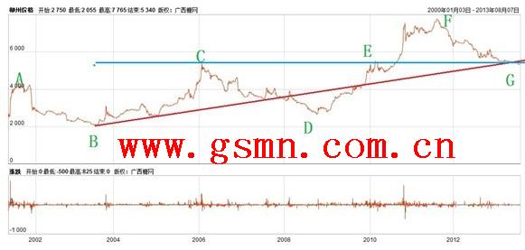 从柳州现货价格的历史走势来看,从2000年到2013年的13年间,柳州现货价格总共经历了三轮明显的下跌过程,分别是:1、从2001年4月的4400元(A点)下跌至2003年8月的2100元(B点),历时28个月,下跌幅度为2300元;2、从2006年2月的5300元(C点)下跌至2008年10月的2700元(D点),历时32个月,下跌幅度为2600元;3、从2011年8月的7700元(F点)下跌到目前的5300元左右,历时24个月,下跌幅度为2400元。