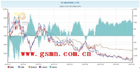 从4月下旬开始,国际糖价持续运行在18美分下方,并且连续创出三年以来的价格新低,受此影响,外糖与内糖的价差空间也被不断的拉大。从上图巴西糖、泰国糖进口估算价与柳州现货价的对比情况来看,当前巴西糖与泰国糖的进口估算价在4300—4400元左右,与5300元的柳州现货价之间的价差达到1000元左右,在6月中旬,两者之间价差最高曾经达到1200元。另外,从上图还可以看出,进入12/13榨季以来,柳州现货价格与巴西糖、泰国糖进口估算价的价差大多数时间内都维持在800—1200元之间,在如此长的时间里内外糖价格出现如此之大的价差,为近几年来所罕见。可以说在很大程度上,2013年国际糖价的低位运行直接拖累了国内糖价的不断走低,内外联动性的不断增强是影响当前国内糖市的一个最主要利空因素。