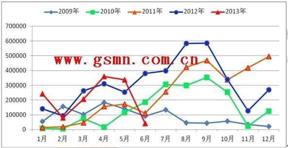 内外糖巨大价差的存在,带来的直接影响便是进口糖数量的增加。如上图国内各月进口糖数量统计所示,2013年1—6月国内累计进口糖126.8万吨,虽然较去年同期144.4万吨的进口量减少了17.6万吨,不过这依然难以掩盖国内食糖进出口失衡的局面。从最近3个榨季进口糖到港的情况来看,之前3个榨季下半年进口糖的数量普遍占到全年进口糖总量的六成以上,而据相关机构预测,本榨季乃至13/14榨季,国际糖市仍然难以摆脱严重供大于求的格局,在相当长的一段时间内国际糖市预计会维持弱势运行,因此下半年国内大规模进口仍然还会成为常态,2013年中国的进口糖数量有望达到300万吨左右,如此巨大的进口需求无疑会对后期价格继续产生强大的压制。