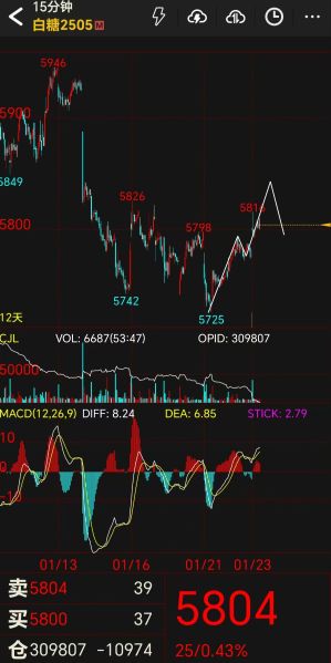 期糖2505合约在减仓中上行,整个节奏紧贴着5790阻挡而进行,说明短线空头在减持,从而使得走势在反向推进。而今天在外盘反弹影响之下,整个反向修复在进行,也就是测试5842的压力位,如果走势没能达到该压力点的话,说明买进兴趣不高,背驰之下将步入多头减持的震荡。附该合约十五分钟图解。