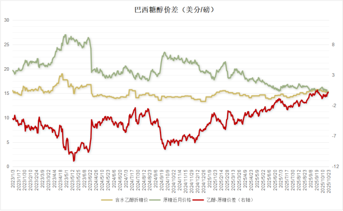 受累于亚洲生产国新榨季供应增加的预期,近期原糖期货价格进一步下探,乙醇价格高位小幅回落但跌幅远小于原糖,乙醇对原糖价格由贴水转为升水约0.1美分/磅,产糖收益下降, 9月下半月巴西中南部制糖比例如预期下降,预计10月份还将进一步下降,10月份的制糖比情况也将缩小市场对25/26榨季食糖估产的区间。
