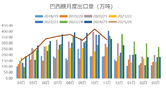11月份巴西糖库存与出口开始收缩,巴西中南部截至11月中旬的工业糖库存为1143万吨,同比增加195万吨,但本榨季的糖库存已在10月中旬达到峰值后拐头向下,后期新增库存将有限。出口端,11月巴西出口糖330万吨,同比下降2.5%,较10月回落20.7%;其中原糖出口292万吨,同比下降4.2%,精制糖出口37.713万吨,同比增长13%。11月巴西糖主要出口目的地依次为中国(44.243万吨)、孟加拉国(36.303万吨)、印度(29.276万吨)、沙特阿拉伯(21.528万吨)和摩洛哥(21.513万吨)。25/26榨季4月-11月巴西累计出口糖2526万吨,同比下降4.9%.