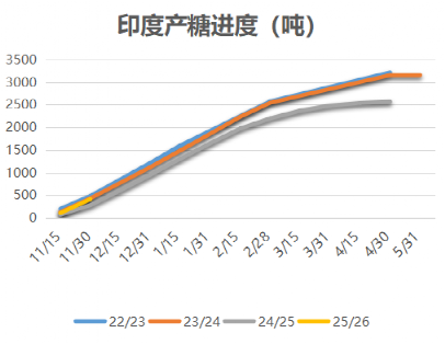 印度25/26榨季甘蔗压榨于10月中下旬启动,截至11月30日424家糖厂开榨,较去年同期增加43家,累计压榨甘蔗4860万吨,同比增加45.5%,产糖 413.5万吨,同比增加50%,目前为止的压榨进度显著快于历史同期。