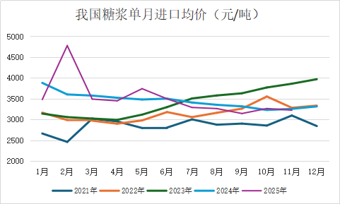11月份我国进口糖浆三项合计6万吨,进口均价3222元/吨,同比下降31元/吨,在近五年同期当中处于第二低的水平,折糖价约4809元/吨。