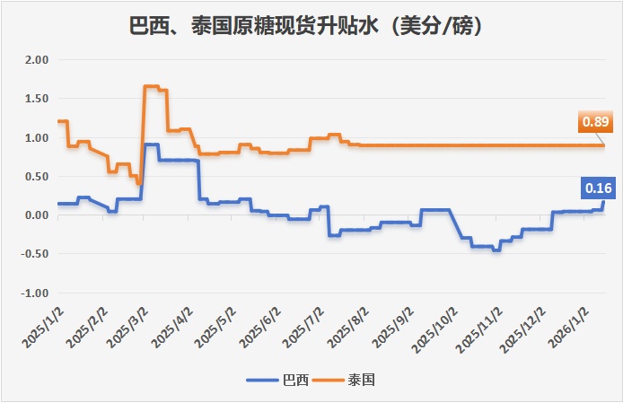 巴西糖现货升水报价主要受供需结构调整驱动。巴西中南部糖厂进入收榨期,新糖供应缩减,库存收紧,截至12月15日巴西中南部工业糖库存为809万吨,较11月底下降22%,同比下降2%。但出口端继续表现强劲,截至1月14日巴西港口等待装运的食糖数量增至166.29万吨,此前一周为158.23万吨。自 12 月中旬以来巴西中南部原糖船运预订量均保持稳定,被视为需求稳健的信号。巴西原糖现货对3月原糖期货合约升水维持在16个点(2月船期)的偏高水平,关注2-3月巴西库存进一步下滑对现货价格的支撑。