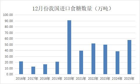 海关总署公布的数据显示,2025年12月份我国进口食糖58万吨,同比增加19万吨,为近十年来同期第二高的水平,仅低于2020年的91万吨。其中白糖5.11万吨,原糖52.8万吨。