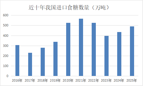 2025年我国累计进口食糖492万吨,同比增加57万吨,为近十年第四高的水平,2020-2022年连续三年进口量均超过500万吨。其中白糖34.41万吨,原糖457.15万吨。25/26榨季截至12月底我国累计进口食糖177万吨,同比增加31万吨。