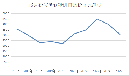 12月份我国食糖进口均价为3039元/吨(到岸价),同比下降933元/吨,为近五年同期最低水平。