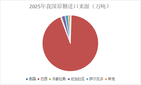 2025年我国进口食糖492万吨,其中白糖34.41万吨,从泰国进口最多14.56万吨,其次是韩国11.83万吨,第三从印度、巴西和毛里求斯各进口约1万吨;进口原糖457.15万吨,其中从巴西进口最多428.04万吨,占比高达93%,其次从萨尔瓦多和尼加拉瓜分别进口9万吨、9.57万吨,还有2.4万吨、2.91万吨分别来自泰国和洪都拉斯,12月份进口的约53万吨原糖仍然几乎全部来自巴西。