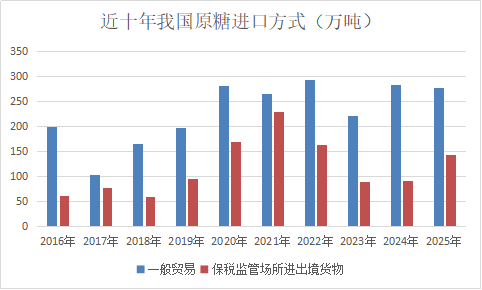 2025年我国通过一般贸易进口原糖277.62万吨,同比减少5.57万吨;通过保税监管场所进出境货物进口原糖143.12万吨,同比大增51.48万吨,也是近三年最高水平。