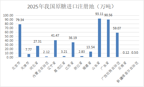 2025年我国累计进口食糖492万吨,其中白糖34.41万吨,进口量最大的为广东8.15万吨,第二是北京7.52万吨,第三为辽宁6.29万吨,第四为山东5.77万吨;进口原糖457.15万吨,其中山东进口量跃升至第一93.11万吨,其次是广东90.56万吨,北京进口量跃升至第三79.34万吨,第四为广西59.07万吨,第五为辽宁41.47万吨,第六为江苏36.19万吨,还有河北27.31万吨。