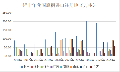 2025年我国通过一般贸易进口原糖277.62万吨,同比减少5.57万吨;通过保税监管场所进出境货物进口原糖143.12万吨,同比大增51.48万吨,也是近三年最高水平。回顾近十年我国原糖进口注册地变化,2025年有一个很明显的特点是北京进口数量锐减,相比去年减少了一半还多,基本是2019年以来最低水平;相应的是其他省区进口量同比均呈现不同程度增长,大部分同比增幅翻番,特别是广西原糖进口量达到近十年来最高水平。具体情况如下: