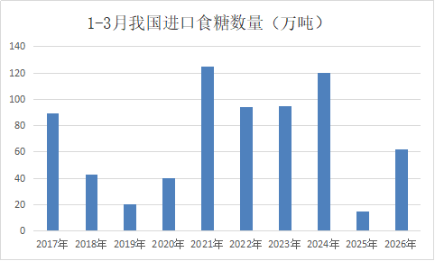 2026年1-3月我国累计进口食糖62万吨,同比增加47万吨,在近十年中处于中等水平。其中白糖4.18万吨、原糖58万吨。25/26榨季截3月底我国累计进口食糖239万吨,同比增加78万吨。