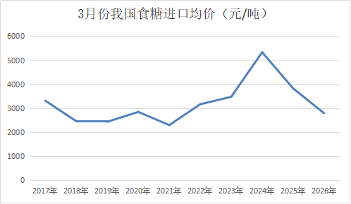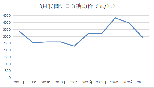 2026年1-3月份我国食糖进口均价为2926元/吨(到岸价),同比大幅下降1039元/吨,为近十年同期第四低的水平,刷新近五年低点。