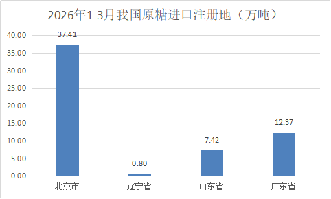 2026年1-3月份我国累计进口食糖62万吨,其中白糖4.18万吨,进口量最大的是广东1.38万吨,其次为辽宁0.87万吨,第三是北京0.7万吨;进口原糖58万吨,其中北京进口最多37.41万吨,其次是广东12.37万吨,第三为山东7.42万吨,还有辽宁0.8万吨。3月份我国进口的7.51万吨原糖,绝大部分7.42万吨为山东进口。