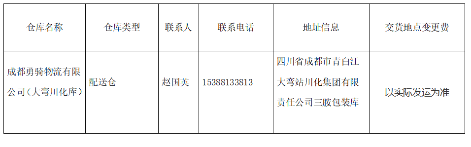 经本公司研究决定,将成都勇骑物流有限公司(大弯川化库)设为配送仓,从即刻起执行,具体信息如下: