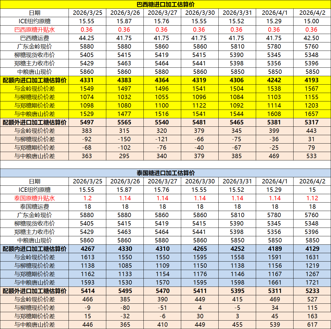 巴西泰国进口糖升贴水、运费及加工成本(4月3日更新)