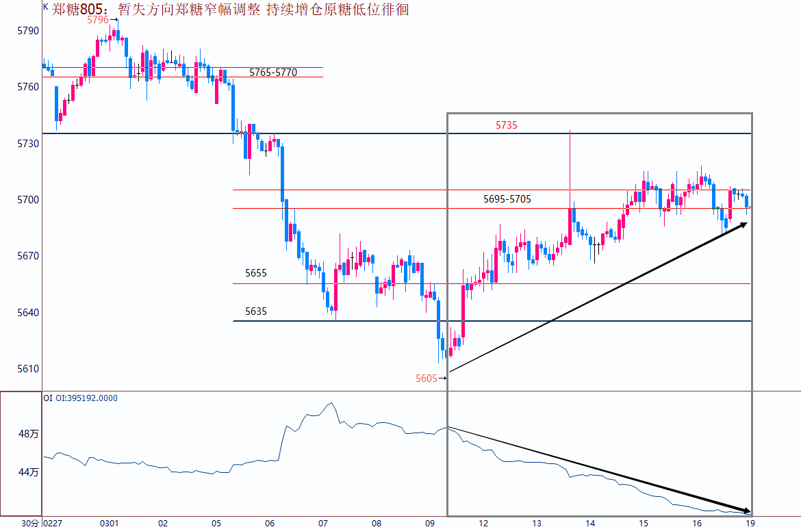 操作建议:1、原糖低位连续大幅增仓、多空分歧严重,总持仓已是历史次高水平;一旦再有利空叠加,恐将再度开启下行探低、寻底之路,15/16榨季低点12.66一线将接受考验,原糖指数13.24之下极弱势对待;2、国内现货企稳牵制期货,但无本质利好,本周末将公布2月进口数据,预期进口仍同比回落,这是否会成为炒作题材须关注;盘面上看,郑糖805如再出现下探后于5635-5655一带重新企稳反扑,则有可能步入阶段性反弹走势,而由于805总持仓已减少至40万之下,目前位置直接反弹的力度和高度将较为有限,更多的则应该是换月所导致的。在无新的增仓行为之前,建议观望为宜,日内短线为主。