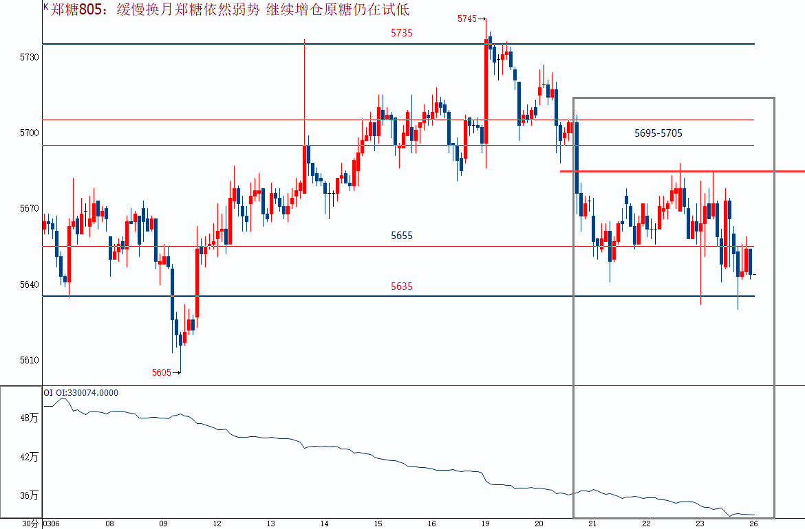操作建议:继续关注5-9换月,随着5月交割月的临近,郑糖805低于现货150-230元/吨,除非现货出现较大幅度的下调,否则其将抑制郑糖805的进一步下行。从投机角度来说,郑糖目前窄幅震荡、调整,除盘中短线外几无任何机会,操作上继续维持空头思维,遇急跌企稳减空为主,不宜杀跌。
