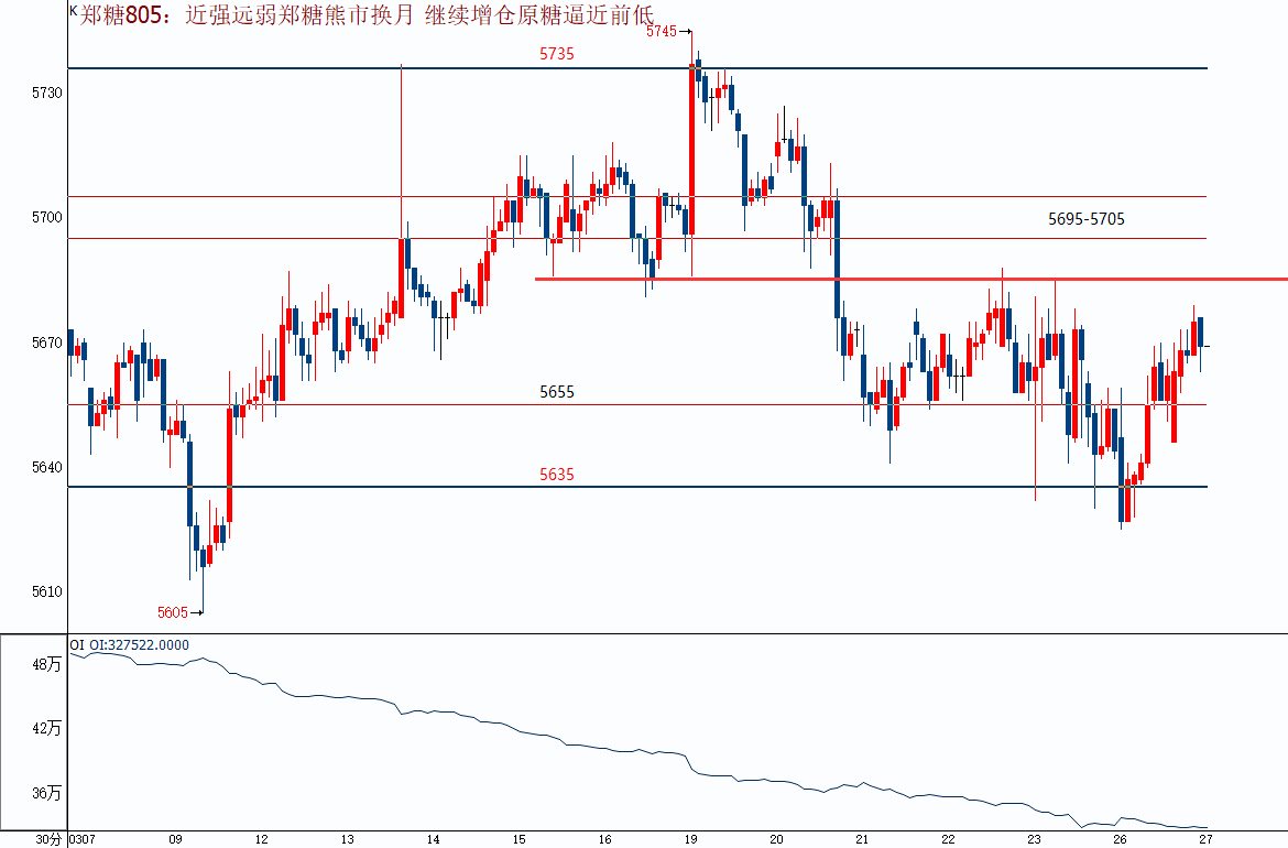 结合盘面看,郑糖805在5685之下继续维持弱势试低、探底走势,如我们近期所建议,每次期价下探,一旦期价企稳都是减持空单的良机,周一郑糖805再次验证。开盘后期价有少许增仓向下穿越5635-5655重要支撑区域,并创出自移仓换月以来的新低,但是随后期价企稳便开始减仓反弹,并形成近强远弱格局,这也是移仓换月常用的手法,当然不排除有投机资金趁火打劫。