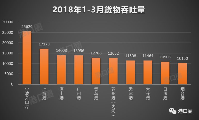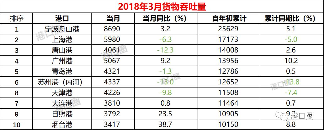 沐甜昆明4月19日讯 根据交通运输部公开信息,2018年3月,全国规模以上港口完成货物吞吐量309235万吨,同比增长0.6%。其中沿海港口完成货物吞吐量219608万吨,同比增长2.6%;内河港口完成货物吞吐量89628万吨,同比下降3.9%。一季度开局,全国港口货物吞吐量呈现微弱增长态势。