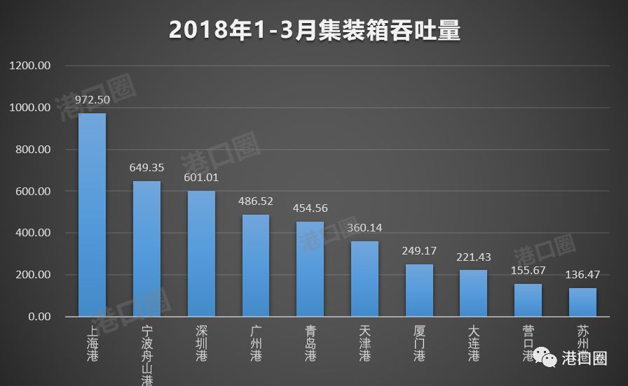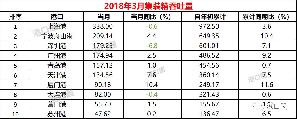 2018年一季度,上海港集装箱吞吐量由于受到大雾天气影响,3月份同比出现微弱降幅。作为头部港口的宁波舟山港、深圳港、广州港,在较大基数的基础上,实现7%以上的增速。