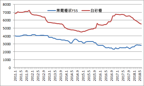果葡糖浆和白砂糖价格走势(元/吨)