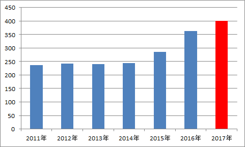 全国果葡糖浆产量(万吨)、2017年为预计